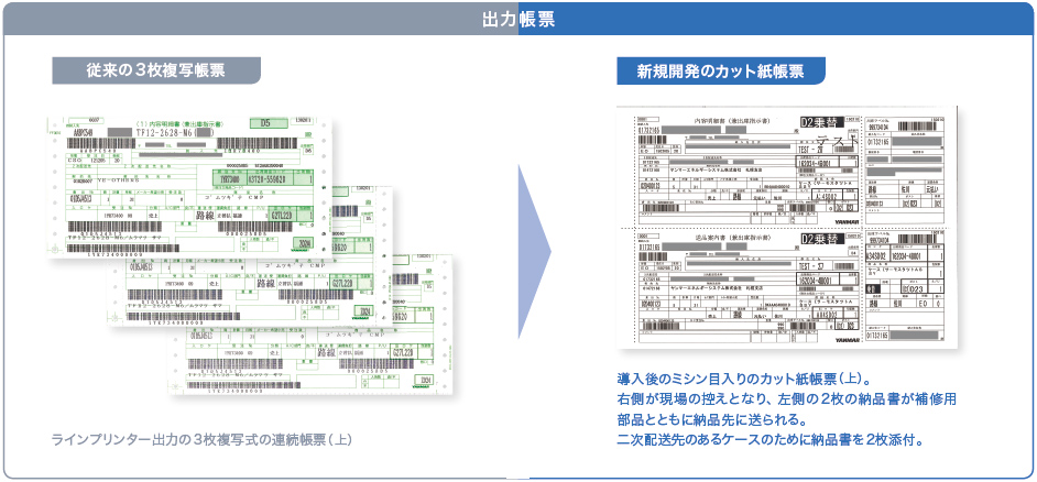 YLS様は、ヤンマーグループが全国の倉庫に保管している商品の輸送業務や倉庫管理業務などを行われています。使用頻度の高い出庫指示書は、従来は3枚複写式の連続帳票をラインプリンターで出力されていました。
