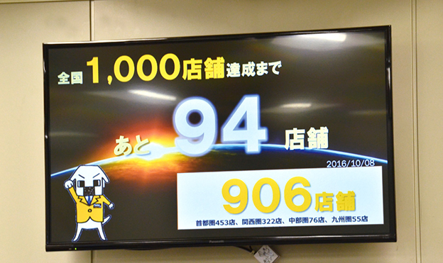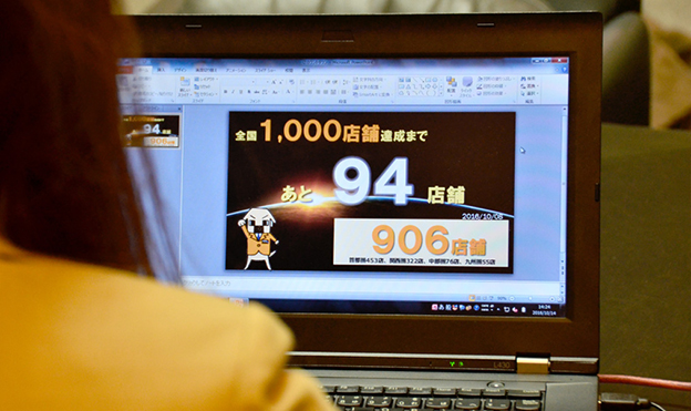また、本社および各支店・オフィスへの配布資料は、きわめて多岐にわたります。先に述べた新規契約店舗のご紹介の他にも、最も重要な中期経営計画1000店舗に対する現在の実績を週2回更新します。さらには、成績優秀者や新入社員の紹介、加盟店説明会やセミナーの案内といった情報をデジタルサイネージを介して本社一括配信でき、手間とコストが大幅に削減できた点も大きいです。同じ情報を、同じタイミングで、全員で共有することで、社員のモチベーションは着実に上がっています。」