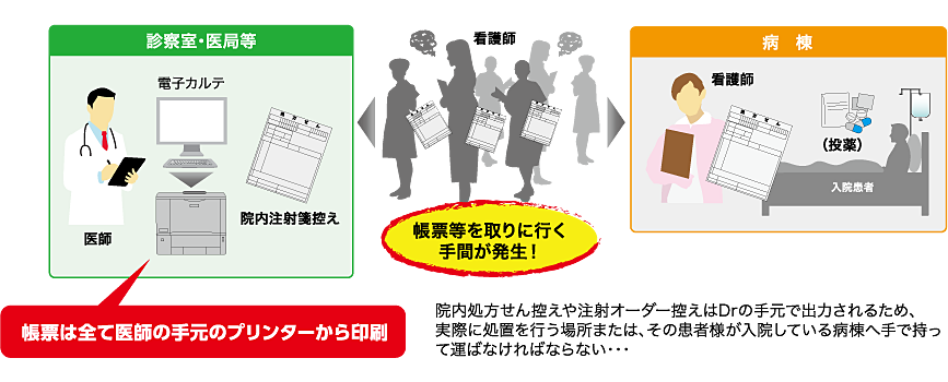 福島県立医科大学 会津医療センター内のSP 4310から出力される印刷物は1日に数千枚に上り、そこではプリンター出力にかかわる課題もありました。医師が外来診察室などで電子カルテから入院患者さんの注射処方せんを指示する際、それは診察室のプリンターに出力されるため、病棟の看護師がその注射処方せんを診察室まで受け取りに行かなければなりませんでした。