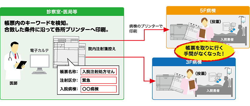 会津医療センター様では、入院注射処方せんの場合、処方区分と病棟をもとに印刷先を振り分ける仕組みとなっています。事後、必要時、緊急、中止の4つの処方区分が注射処方せんに記載されている場合、対象となる患者さんのいる病棟・階のスタッフステーションのプリンターに出力されます。目的のプリンターが動作していない場合は、従来のように電子カルテを操作する医師の手元のプリンターに出力することにより、指示の漏れを防ぐようにしています。
