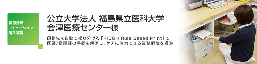 会津医療センター様は、会津地域全体の医療を支える総合医療機関として最先端の診療を進めています。リコーでは、RICOH Rule BasedPrintを通じ、処方せんなどの印刷にかかわる「困り事」を解決するソリューションを強化、拡充してまいります。
