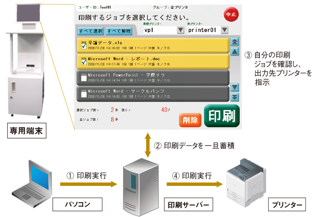印刷制限設定画面スプールした自分の印刷ジョブを、操作端末上で確認しながら印刷指示。必要なものだけを印刷指示するため、安易な印刷によるムダを省くことができます。空いているプリンターで印刷できるため、印刷集中時の混乱や文書の取り間違いもありません。プリンターをシームレスに活用し、ユビキタスなプリント環境を構築できます。