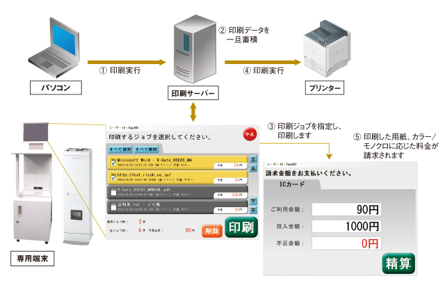 リコーのコインラック、プリペイドカード、ICカードに対応。専用のタッチパネル操作端末から自分の印刷ジョブを選択して印刷します。画面の請求金額をコインラックなどの課金装置で入金、精算できます。印刷にかかる料金を利用者に負担してもらうことで、印刷コストの改善に役立ちます。また、カラー/モノクロページを自動的に判別し、課金を行うこともできます。