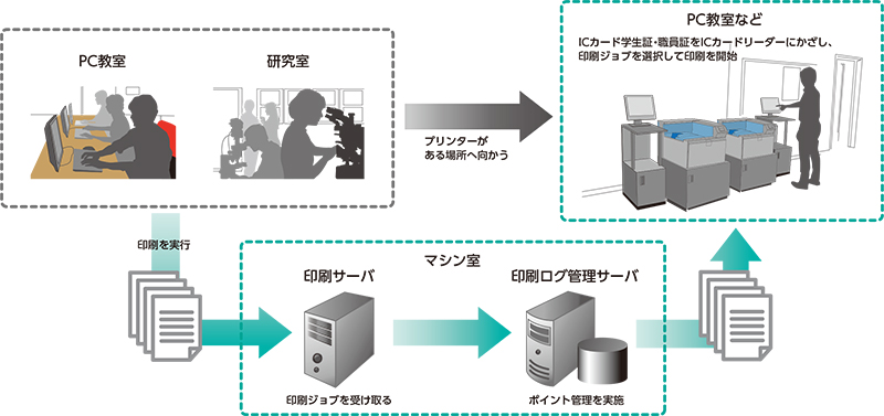 学内ネットワークに接続されたパソコンから印刷の操作を行い、学内に34台設置されているどのプリンターからでも出力を受け取ることが可能。学生の利便性も大きく向上した。