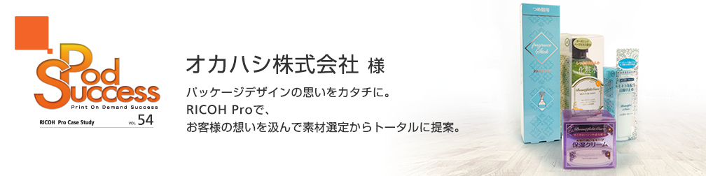意匠性が高い商品パッケージの総合メーカーであるオカハシ株式会社様。透明素材、蒸着紙など、デザインの幅は多岐にわたる。ホワイト・クリアトナーを採用するRICOH Proの導入により、提案のバリエーションを広げ、顧客の意思決定スピードアップにも大きく貢献。