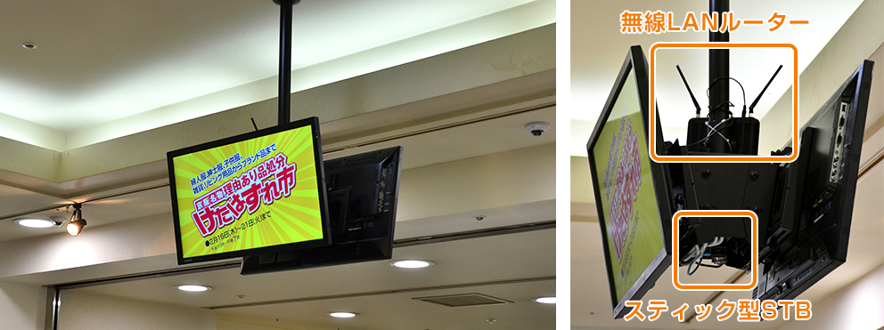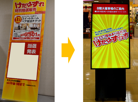 館内での催事告知は、以前は印刷ポスター(左)を製作していましたが、デジタルサイネージ(右)に変更。