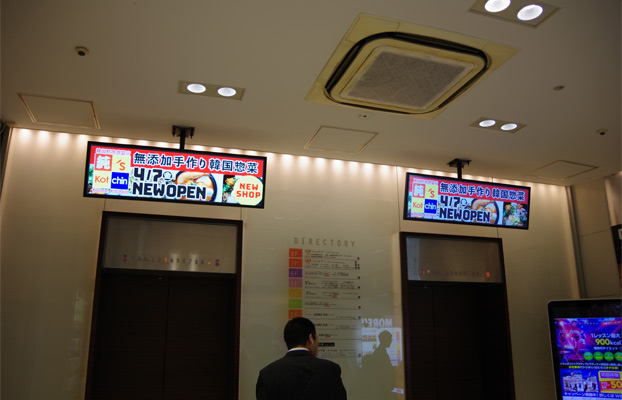 エレベーターの待ち時間によるストレスを軽減させたいという狙いと、店内の情報発信をしたいという狙いから、エレベーター前の上部にデジタルサイネージを設置。