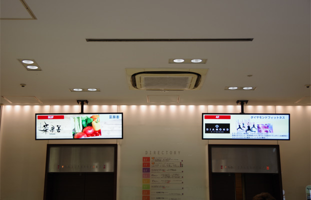 エレベーターの前の上部にデジタルサイネージを設置することで、エレベーターの待ち時間にテナントの案内ができるようになり、回遊性を高めると同時に待ち時間のストレスの軽減することができた。