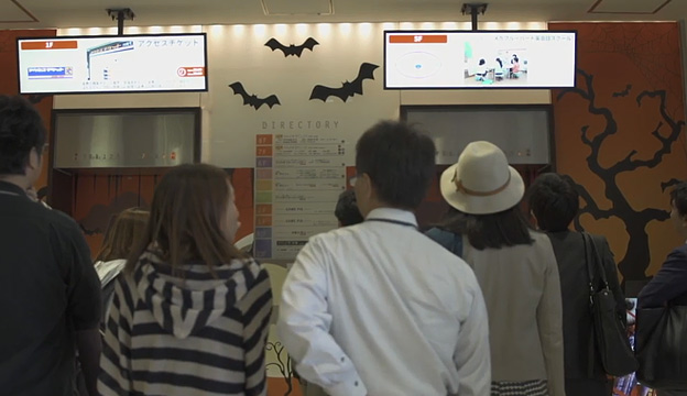 1階入口に設置したタッチパネル型のデジタルサイネージでは、フロア案内は1人で見るだけでなく、お連れ様と2人で見ることが多いという意見を頂き、2人並んでも操作できる大きい画面で、さらに車椅子やお子さんにも配慮して、低い位置でも操作して見れるような筐体をご提案頂きました。ここでは、フロア案内やテナント情報をタッチパネル向けコンテンツで製作。設置後は、お客様のサービス向上につながっています。