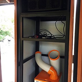 プロジェクター等を格納する特注の機材ボックス。空調と吸排気設備を内蔵している。