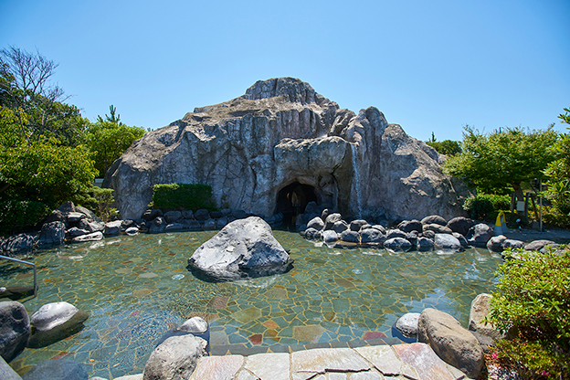 プロジェクションマッピングの舞台になった「大滝の湯」。右側に実際の滝が落ち、中央は洞窟風呂になっている。