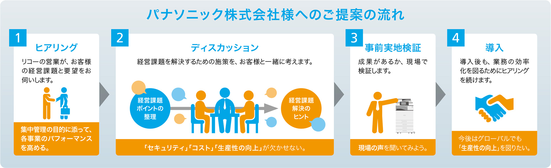 ヒアリング、ディスカッション、そして事前実地検証、導入。パナソニック様が抱える経営課題を共に探し、解決方法を考えた。リコーでは、様々なお客様に対して、個々の提案を行っている。それはお客様、業態によって何一つ同じことはないからだ。