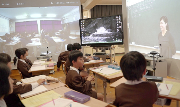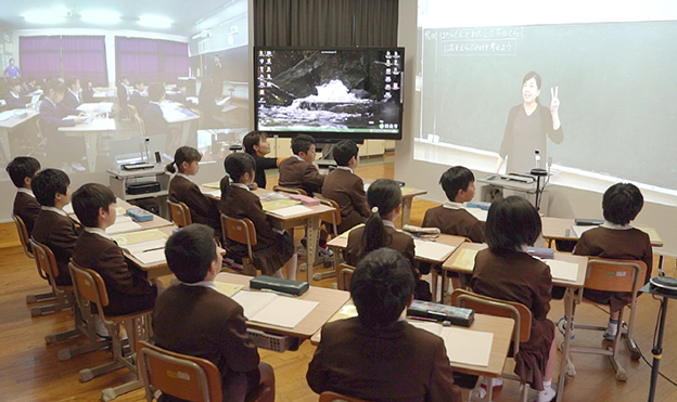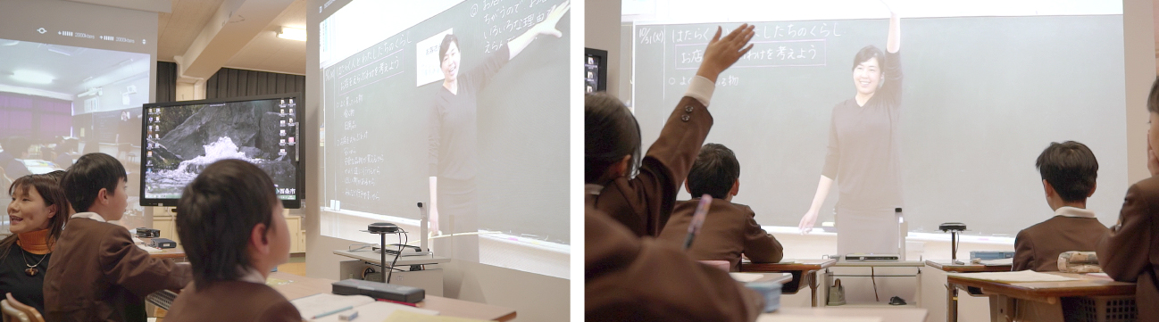 「システムは各校に設置しましたが、1年目は機器を整備してきちんとつなぐことに力を入れました。150インチの2つのスクリーンは、正面は先生を、サイドは児童を映し出して、最初につながった時は子どもたちも大喜びでした。室内数カ所のマイクがこちらの教室の声を向こうの教室に届けてくれますし、向こうの声はスピーカーを通してこちらに届きます。声を弾ませて子どもたちの交流が進んでいました。2年目になりますと、1年目で築かれた子どもたちの関係を活かした授業づくりへと進み、3年目の現在は、年間を通して当たり前のようにつなぐ毎日の中で、より効果的な活用法を現場の先生と一緒に取り組んでいるところです。」