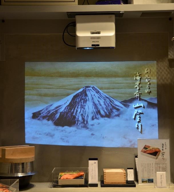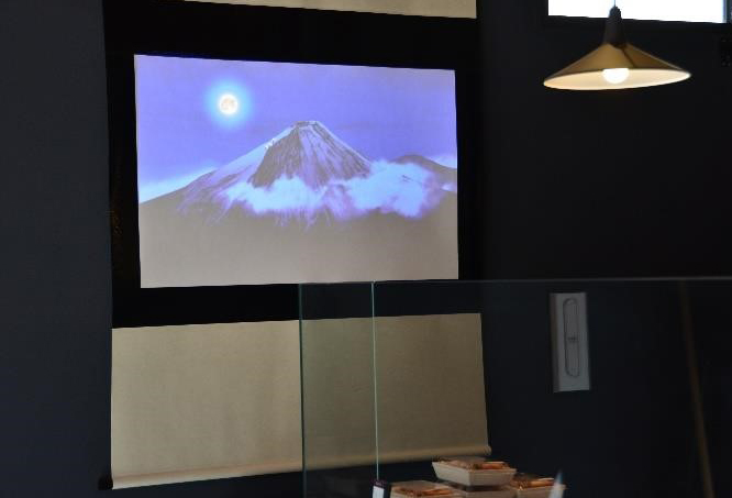 また、築地の店舗では、同じ映像を掛け軸風のスクリーンに投影し、絵が変わる掛け軸として、プロジェクションマッピング的な演出を実施して、お店の雰囲気づくりに一役かっています。