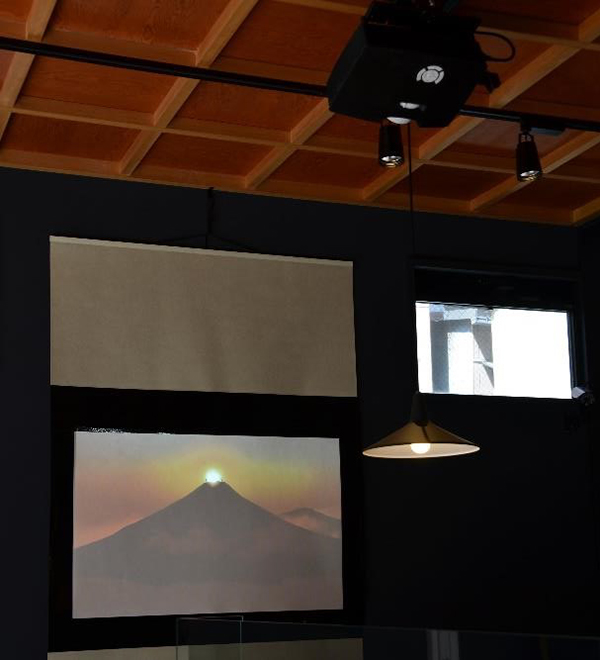 天井からプロジェクターを吊るして、掛け軸風のスクリーンに映像を投影。(築地直売所)