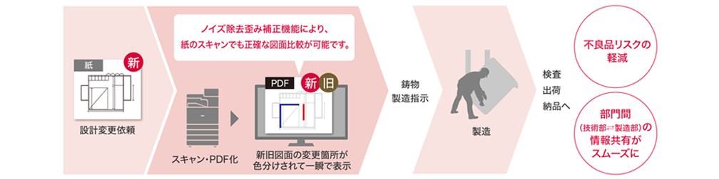 「紙で検図していた時は、複雑なものだと半日かかることもありました。技術部の仕事は検図の他にもたくさんありますから、極力時間はかけたくないのです。この比較ソフトを使えば、一瞬で変更箇所がわかります。ボタンを押すだけで新旧のPDFをパソコン上で重ねて、追加箇所を赤色で、削除箇所を青色で表示してくれます。これまで検図に割かれていた作業時間が激減しましたし、目視より見落としが防止されるので、とても効率が良いです。歪み補正機能も便利だと感じています。紙図面をスキャンした場合のノイズや歪みを除去して補正をかけてくれます。今後は技術部全員で活用して効率化を図っていこうと話しています。(田口様)」
