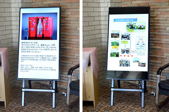 こうした幅広い事業を展開している薩󠄀摩酒造様では、社内外への広報活動にデジタルサイネージを活用されています。商品宣伝に留まらない、焼酎造りのこだわりやイベント案内など、薩󠄀摩に伝わる焼酎文化をタイムリーかつ多角的なアプローチで配信。「新酒まつり」には「明治蔵」の館内案内にも活用されています。