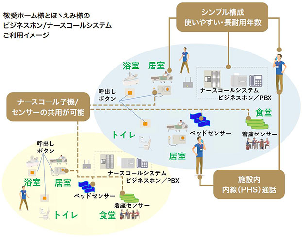 また、ふたつの施設のシステムを同一メーカーにすることで、操作性の統一感をもたせることができ、呼び出し子機やマットセンサーも共用できるといった提案もありました。