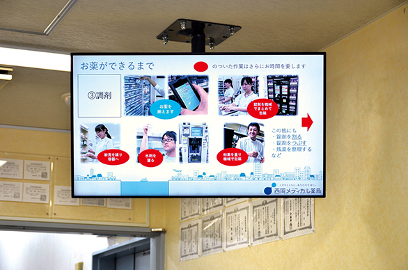 そんな西岡メディカル薬局様では、地域から信頼され選ばれる店舗づくりの一環として、デジタルサイネージを活用されています。各店舗の患者様層に合わせた商品の紹介や健康アドバイス、薬に関するクイズ、さらに薬剤師の紹介などを、札幌の事務所から各店舗へ遠隔配信。コンテンツを見た患者様から気軽にお声掛けいただくようになるなど、デジタルサイネージが「相談するきっかけ」を生み、患者様と薬剤師をつなぐ役割を果たしています。親しみやすさにも配慮した多様な情報配信が、待ち時間のご負担を軽減するとともに、薬局への安心感、信頼感を育んでいます。