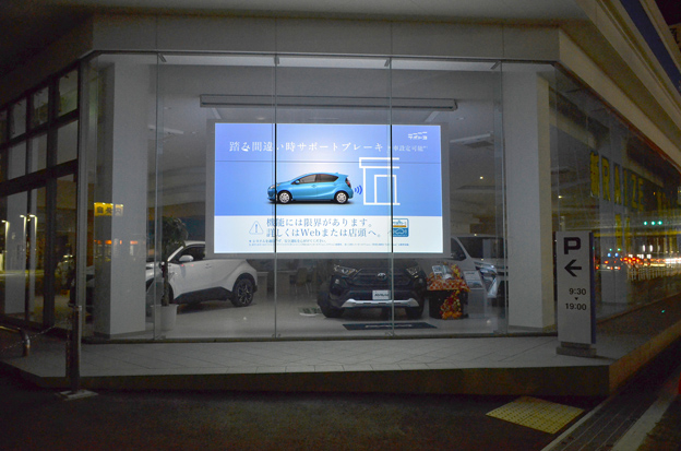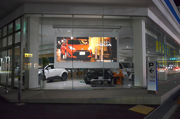 ネッツトヨタ岐阜株式会社 大垣店様では、国道に面した立地環境を最大限に活かし、デジタルサイネージによるダイナミックな情報発信を展開されています。営業時間終了に合わせてタイマーで透過型スクリーンを下ろし、プロジェクターから店外に向けて映像を投影。夜のショールームから色鮮やかな映像が流れる演出は、新型モデルの疾走感や洗練されたブランドイメージを、いっそう強く印象付けます。