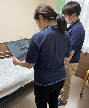 ベッドセンサーの検知スピードは速く、とてもメリットを感じています。端座位でアラートを発報する設定をしていますが、アラートで訪室してもご利用者様はまだベッドの上にいらっしゃるので、歩行介助に間に合います。