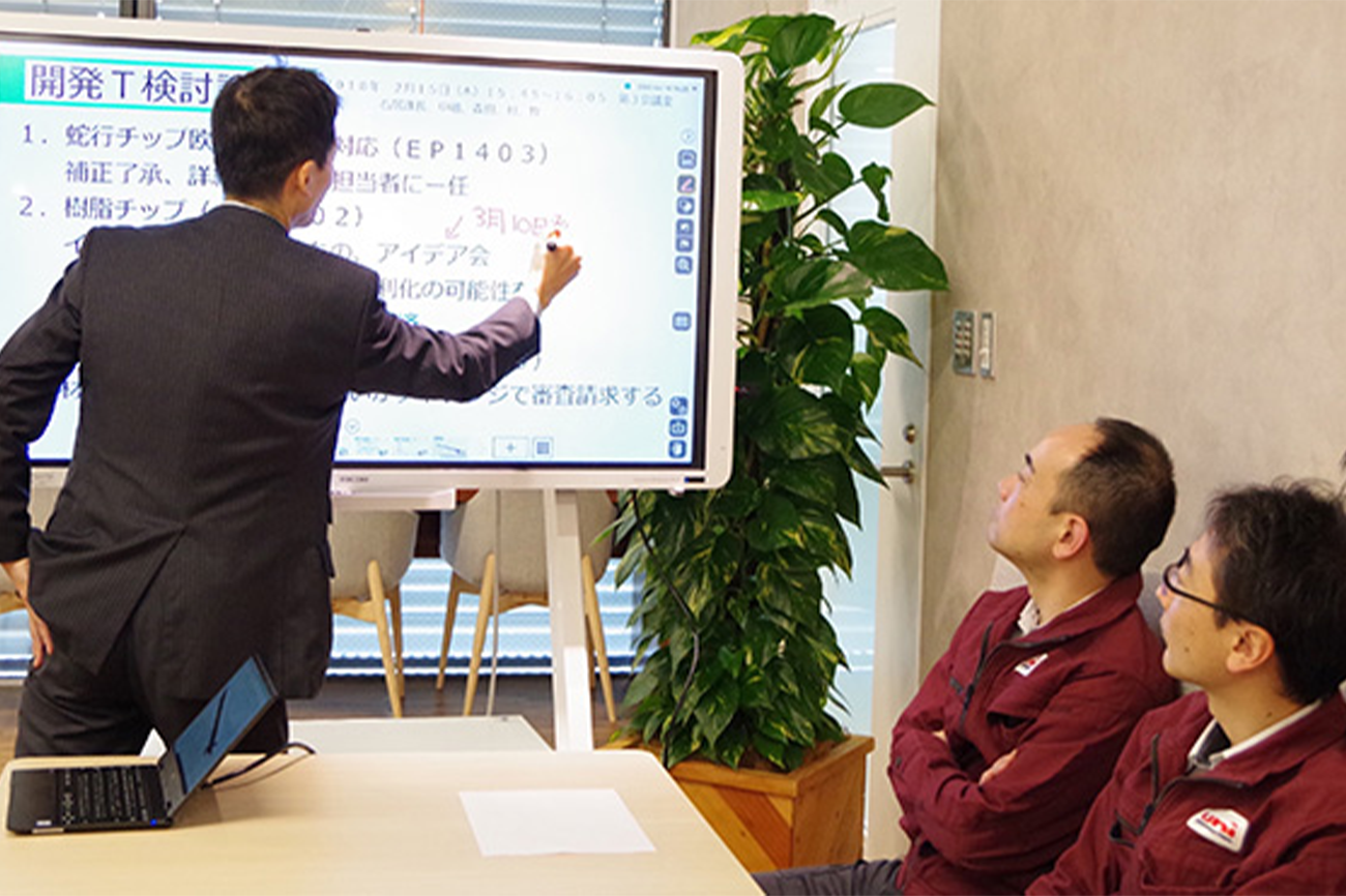 「定例会議では主に特許申請への進捗を確認するのですが、RICOH IWBに直接書き込むことで進捗状況をリアルタイムに更新、修正できるのが非常に便利です。
