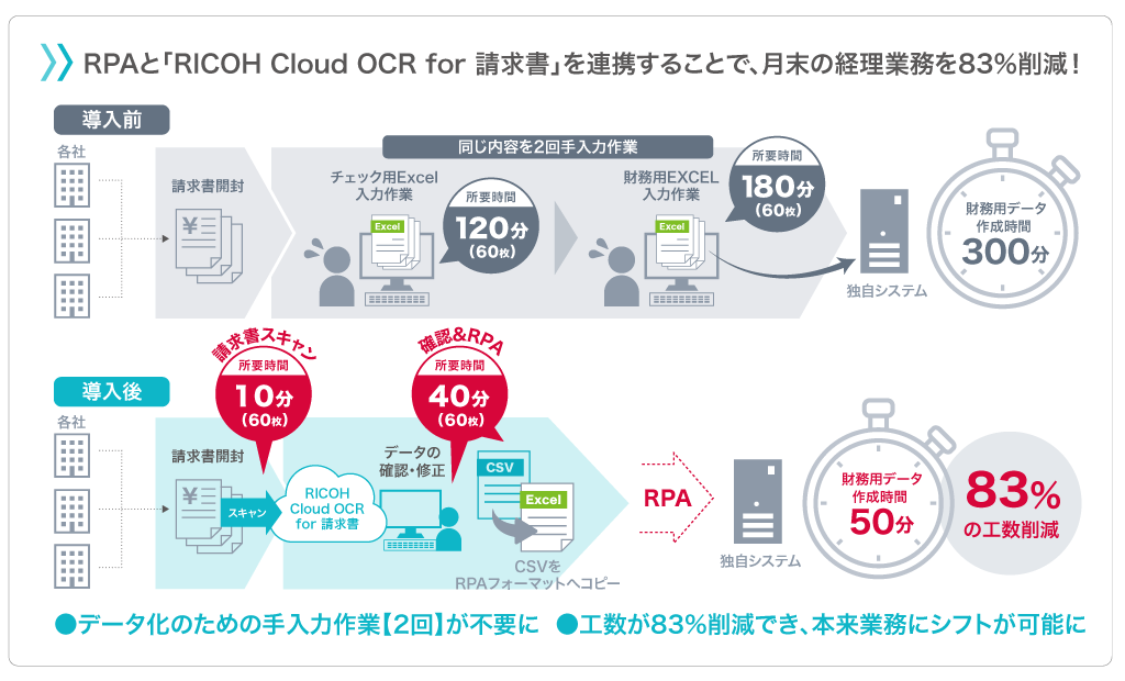 RPAと「RICOH Cloud OCR for 請求書」を連携し、経理業務を自動化。作業時間の83%を削減。