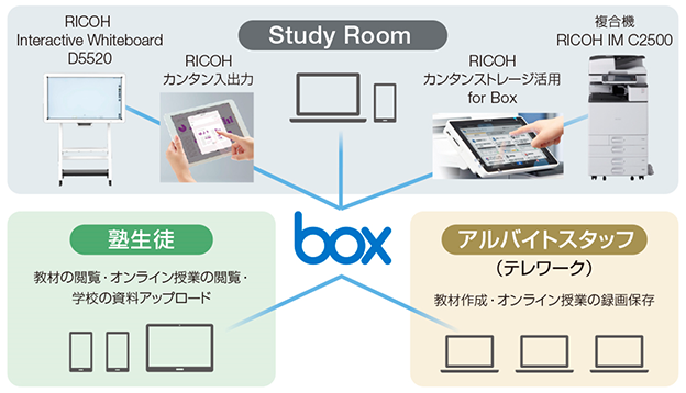 塾の生徒たちは塾内のIT機器を自由に使うことができます。「生徒たちにはBoxも開放しています。教材の配布や、録画したオンライン授業の共有はもちろんのこと、学校で配布されたプリントなどをスマホで撮影して、画像をBoxにアップし、塾に来て複合機を使って出力しています。まさにスマホ世代らしい使い方をしており、生徒たちにも好評です。授業でもBox内の教材をRICOHカンタン入出力アプリを使ってRICOH IWBに表示したり、その内容をBoxに保存したりと、最大限活用しています」」