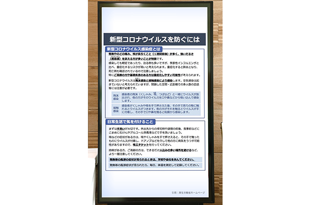 新型コロナウイルスは多くのお客様が気にされている状況ですので、デジタルサイネージで最新の感染症対策を分かりやすくお伝えし、注意喚起につなげています。