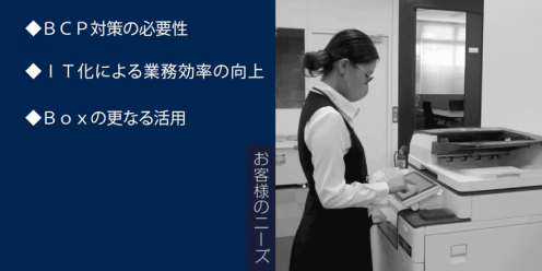 紙ベースでやり取りされている書類を直接Boxに格納できるようになり、BCPを実現。