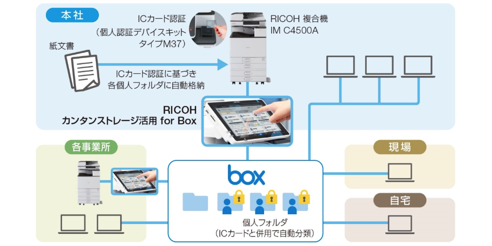 複合機のICカード認証を使うことで、Boxの個人フォルダーにスキャンしたデータを直接送れるようになり、