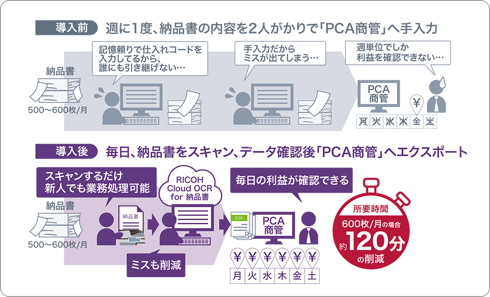 毎月500~600枚の大量の納品書を全て手入力していたため、 時間もかかりミスも多かった。
