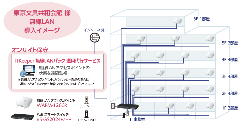 従来、東京文具共和会館様には有線LAN・インターネット環境が整備され、会議室の有線LAN端子に接続する可搬式の無線LANアクセスポイント2台を、希望者に貸し出していました。ところが2020年の新型コロナウイルス感染症拡大により、リモートでの在宅勤務など場所に捉われない働き方が増加。会議室を他拠点や遠隔地とつなぐインターネットの利用が多くなり、また、多数の端末の同時接続が可能な無線 LAN の利用も増えました。