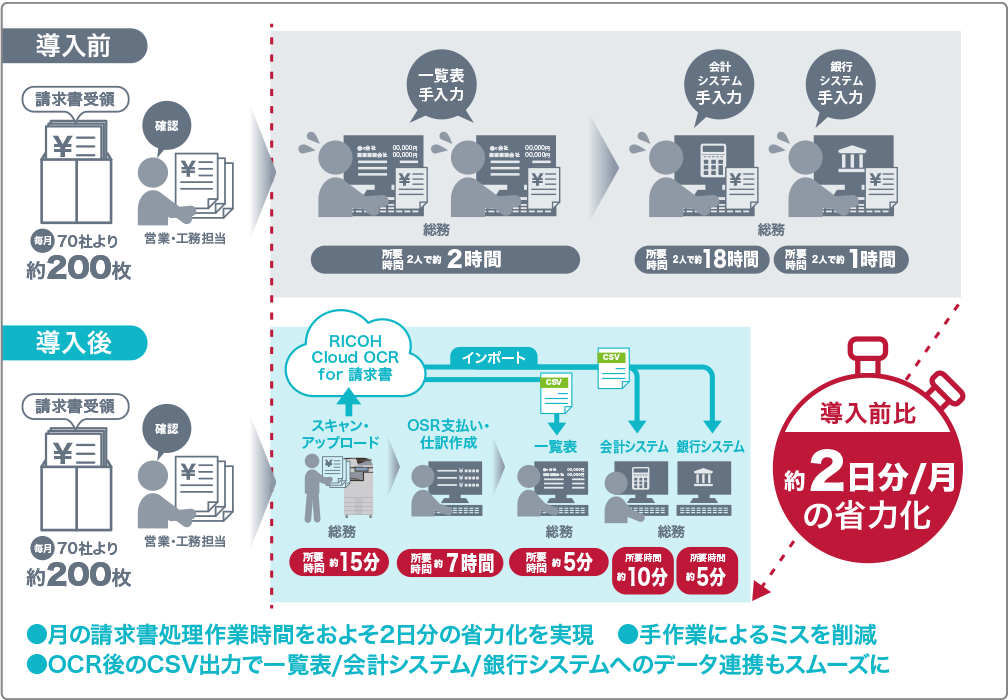 OCRの自動読み取りにより、請求処理がチェックだけで済み、毎月2日分を要した入力作業から開放された。