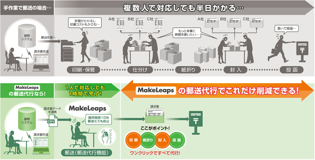 手作業では半日かかる発送作業が、「MakeLeaps」なら操作時間わずか10分で完了。