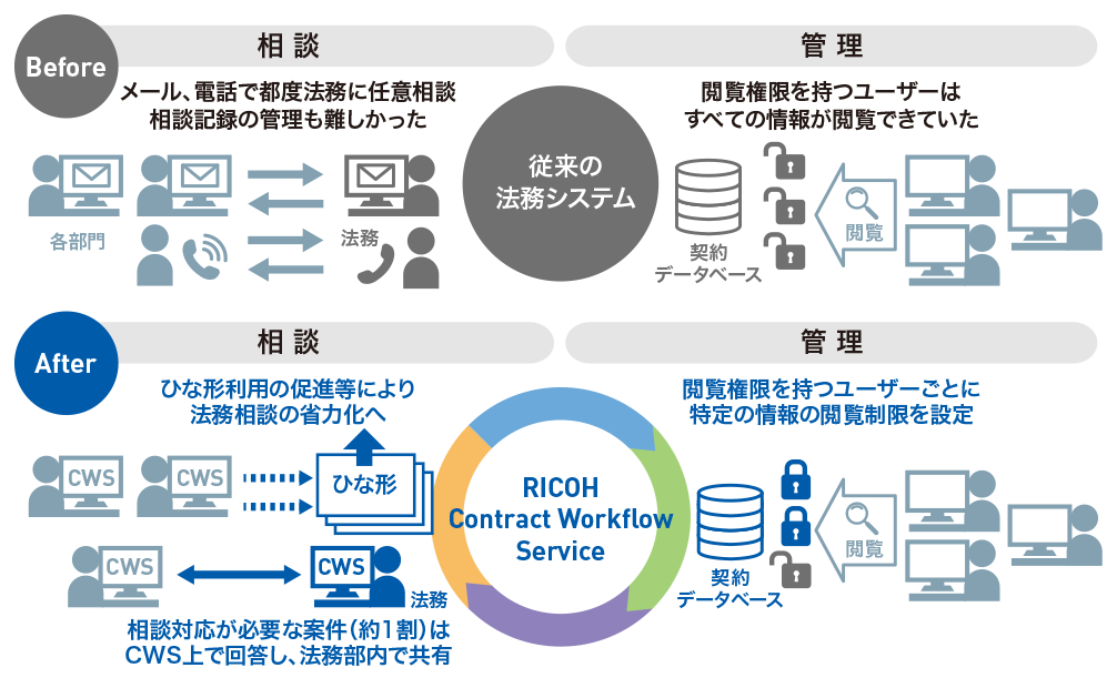 CWS導入のきっかけは、内製システムのサポート切れです。そこで新システムの複数の候補を比較検討し選定しました。CWS選定の理由は、法務相談の記録と契約データベースの機能により、法務部でその記録を一元管理できることです。法務相談をまとめて記録でき、部員間でノウハウを共有できるのが一番大きなメリットで、パッケージ製品でリコー社内での実践実績があることも決め手になりました。ほかのお客様のニーズも含め、自動的にどんどん機能がアップデートされるのも非常に魅力的です。