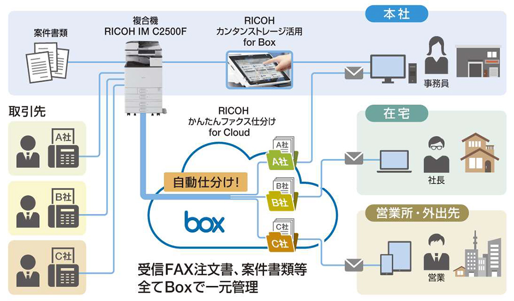 受信ファクスを直接Boxに格納し、通知されるようになったため、レスポンスが向上し、注文書の仕分けも効率化できた