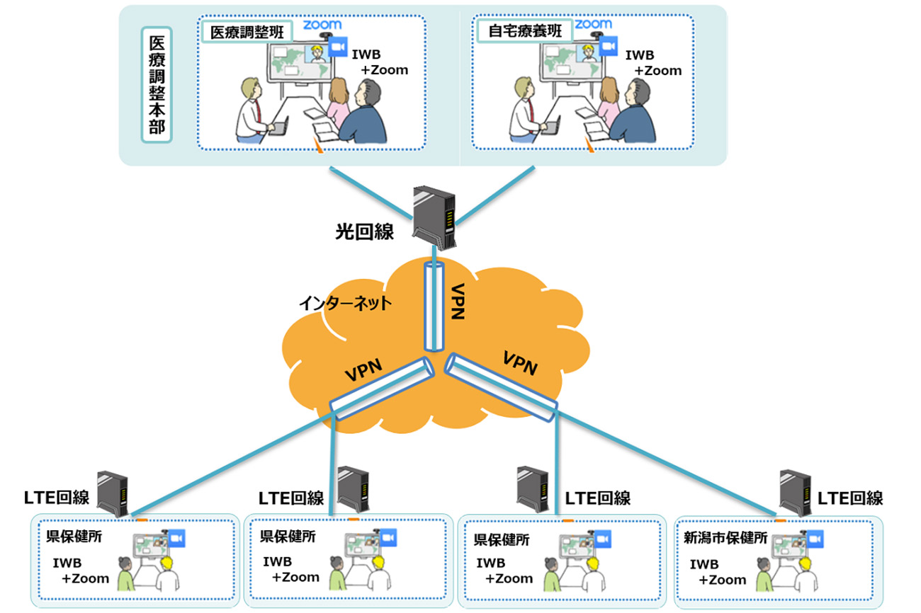 相談を受けたリコージャパンは、大至急1週間でモバイルVPNネットワークを整備し、県庁の医療調整本部と新潟市保健所にRICOH IWBを設置。さらに、RICOH IWBとZoomを連携させることで顔を見ながらコミュニケーションが取れる環境を構築しました。