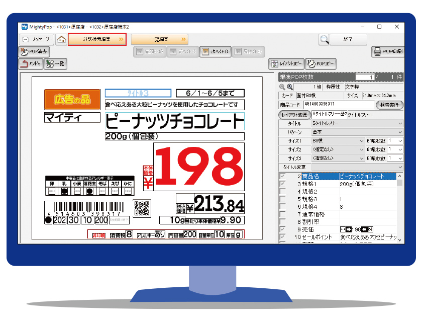 同社販売システム本部販促企画部情報システム部の大津敦史部長代理は「値札POPは本部で制作したデータを公開し、各店舗で出力しています。当社では、貼付ミスを最小限にするため、店舗スタッフがハンディターミナルで商品と商品棚のバーコードを読み取り、マッチしたPOPを出力して貼り替えるという業務フローを取っています」と語ります。