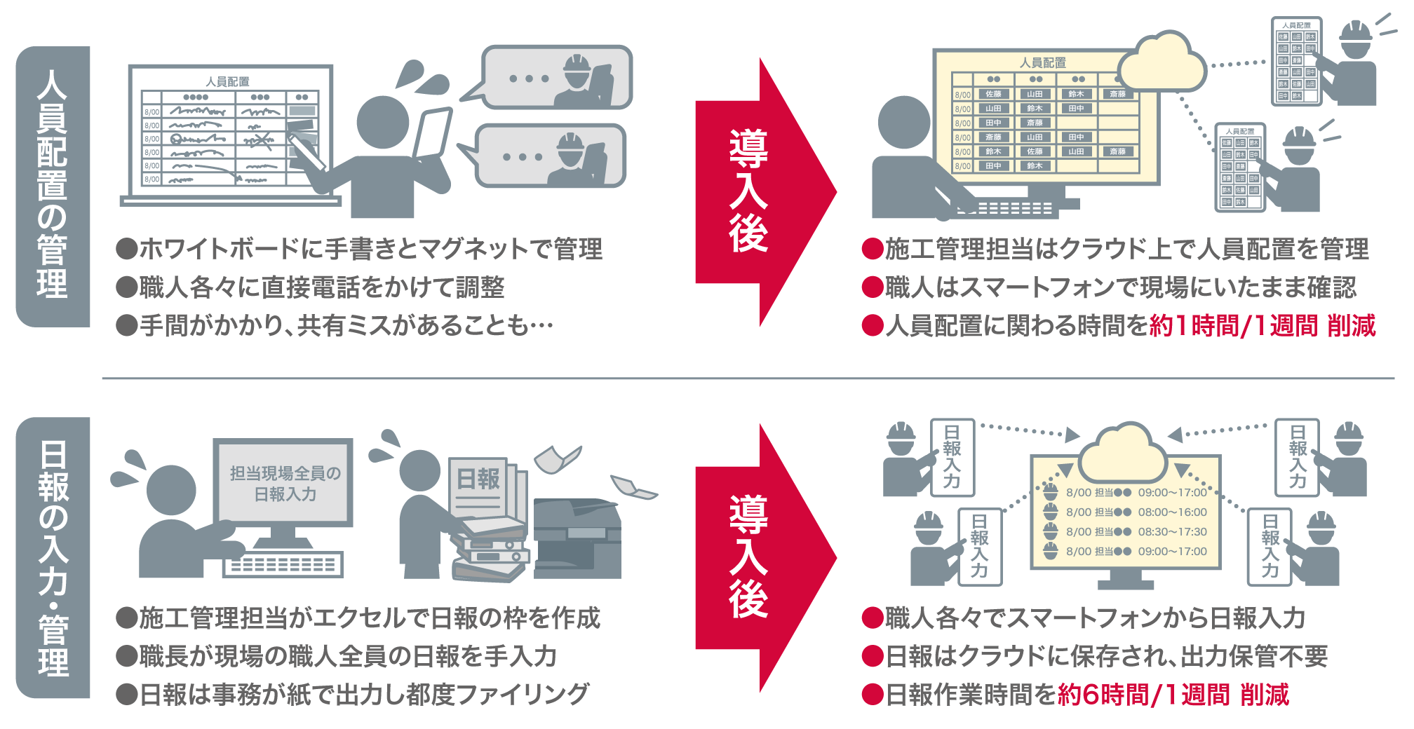 同社はホワイトボードで人員配置を管理していましたが、業種柄もあり配置変更が多く、ホワイトボードへの手作業の変更は大きな負担でした。さらに職人への電話連絡の手間や連絡ミスなどの課題もありました。そこでテレワークまるごとパックを導入したところ、業務に変化が表れました。「施工管理担当者が配置を変更するとリアルタイムで職人に伝わり、連絡ミスや行き違いが激減しました。翌日の段取りもしっかりできるため、大きな効果が出ました」と庄田様。