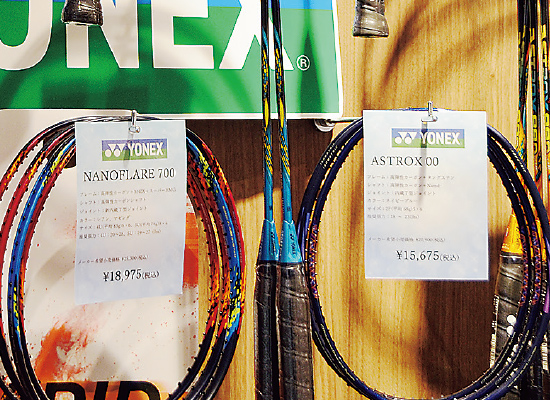 店内には多彩な仕様のラケットが並んでいる。