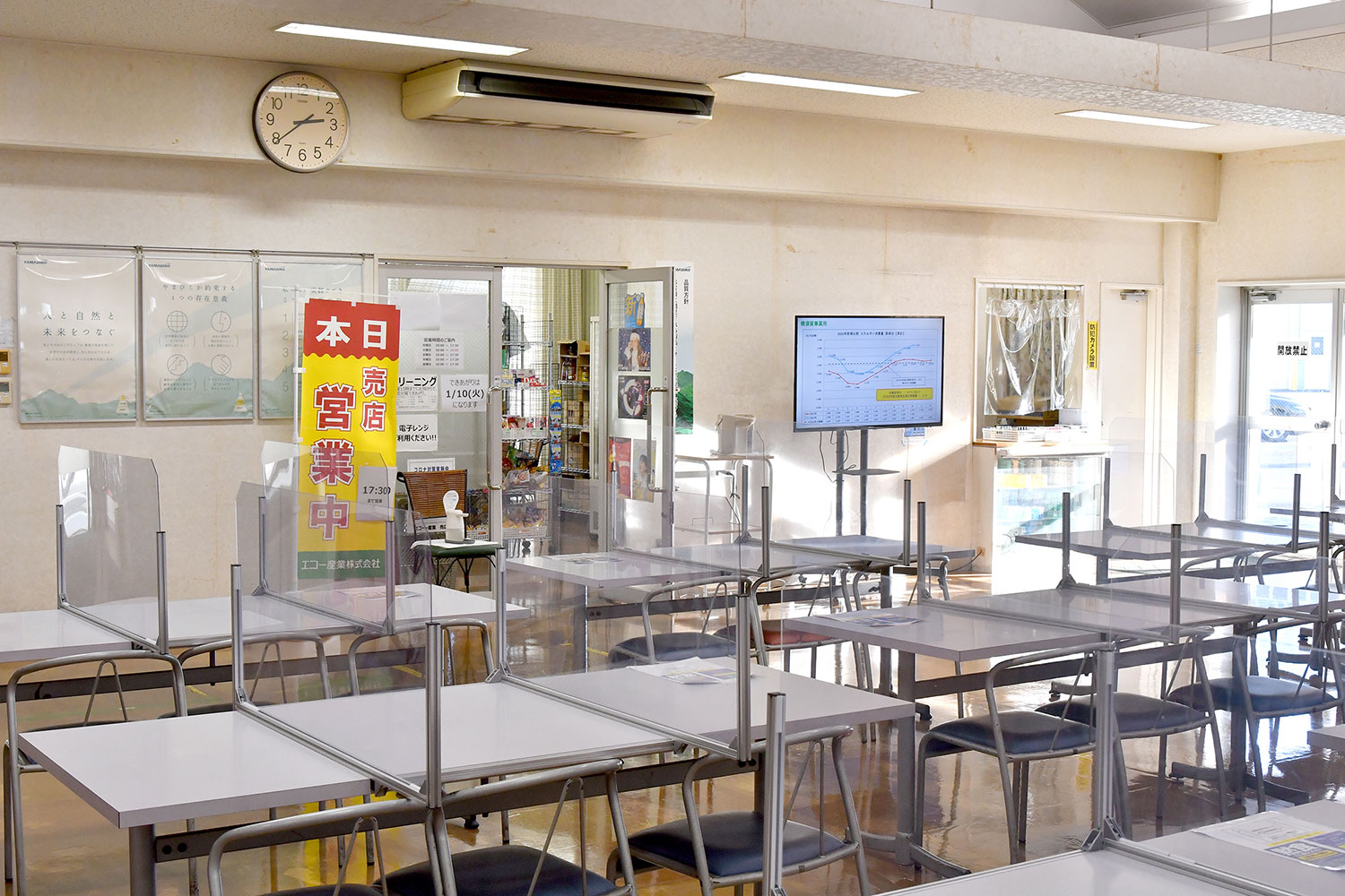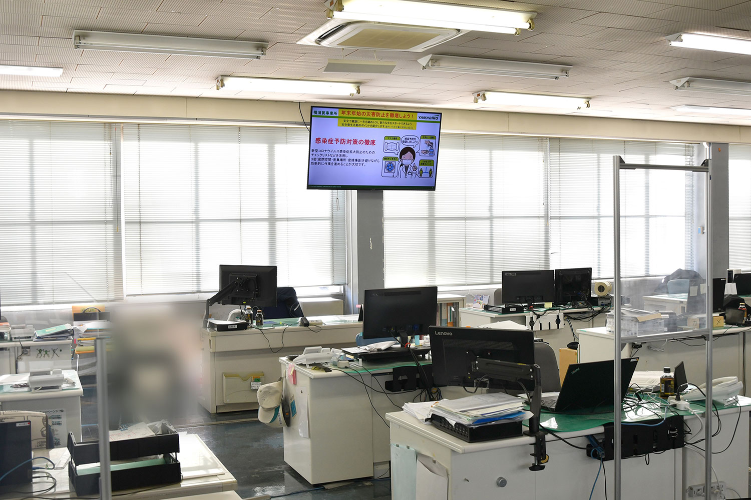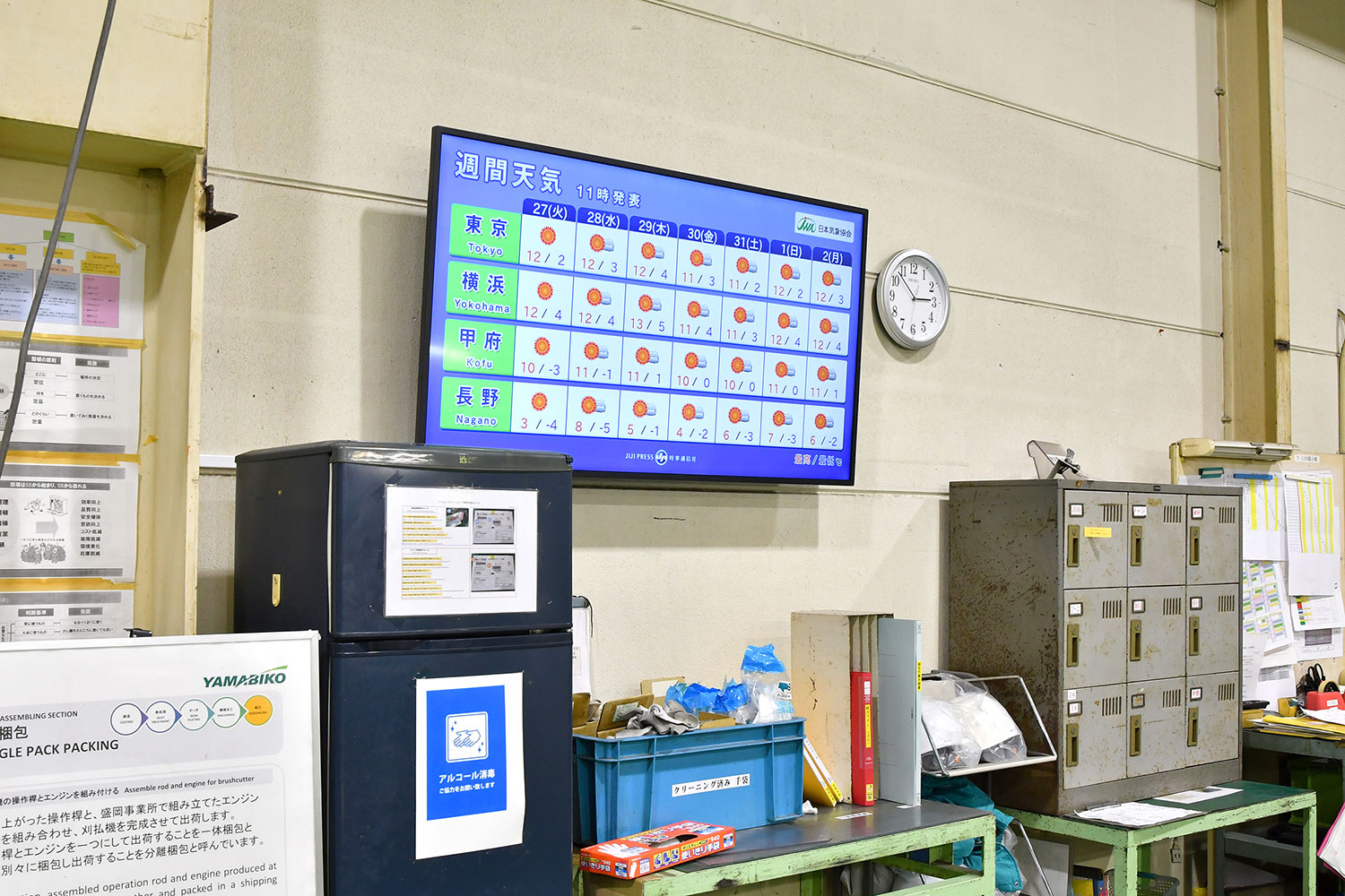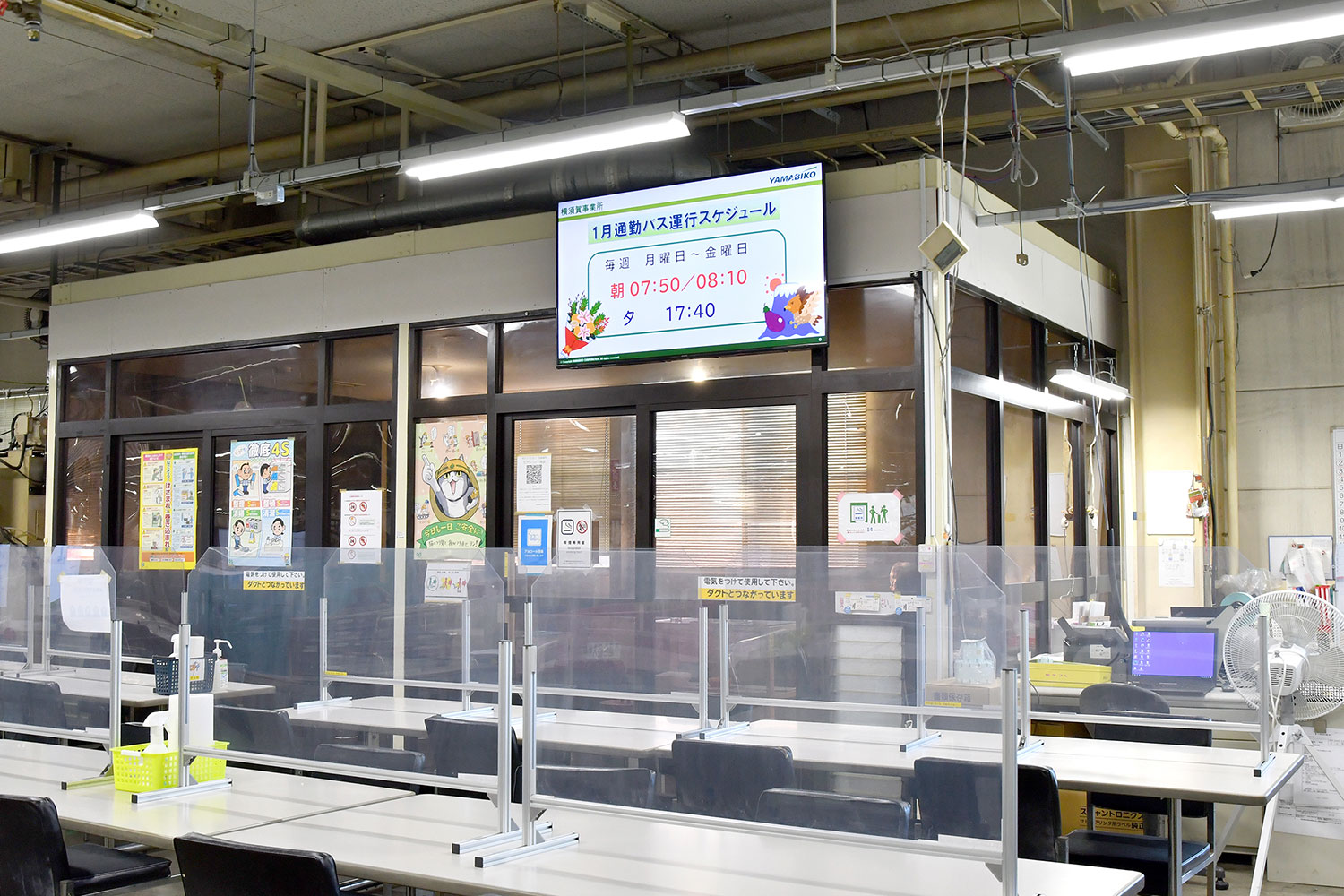 青梅(本社)に5台、横須賀に15台、広島に5台、盛岡に10台、合計35台を導入し、工場内のほか、事務所、食堂、休憩スペースなど従業員が多く通る場所にディスプレイを設置しています。