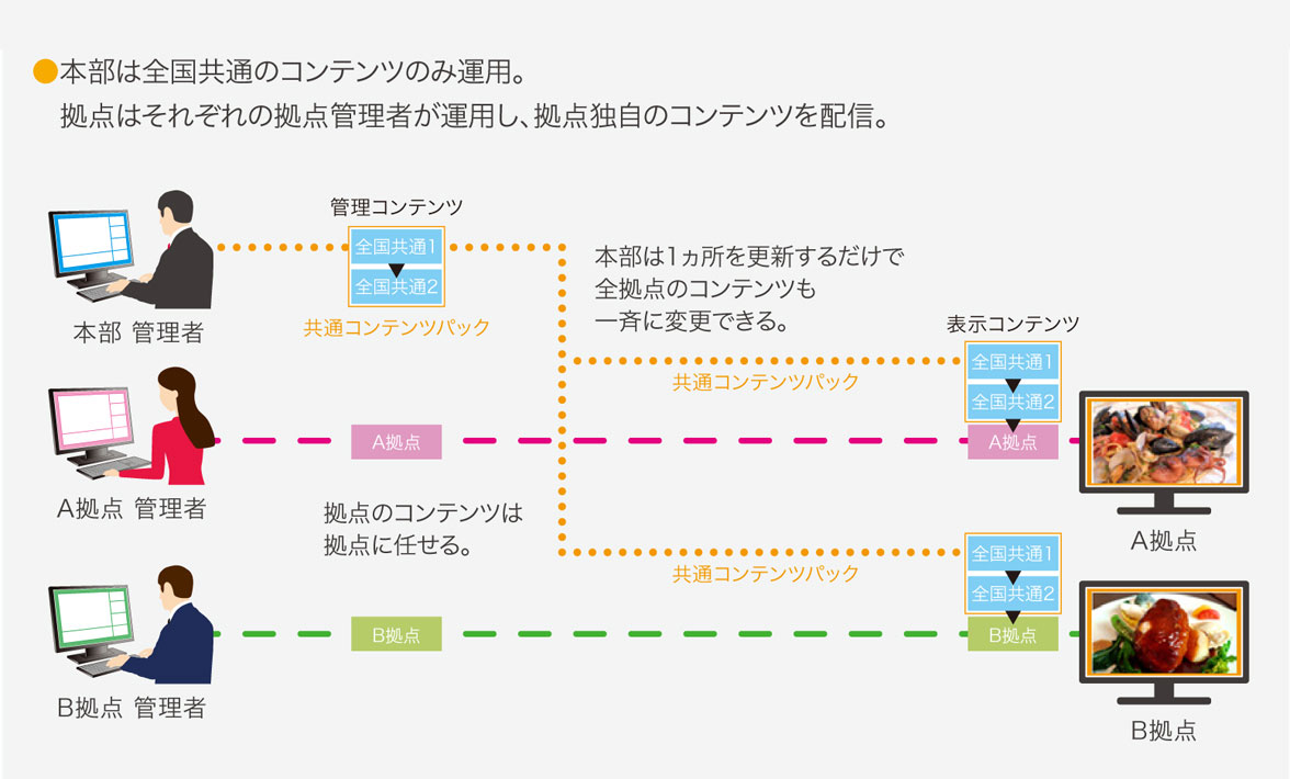 ・本社から一括配信するだけでなく、各事業所も独自のコンテンツを事業所内で自由に展開できる。