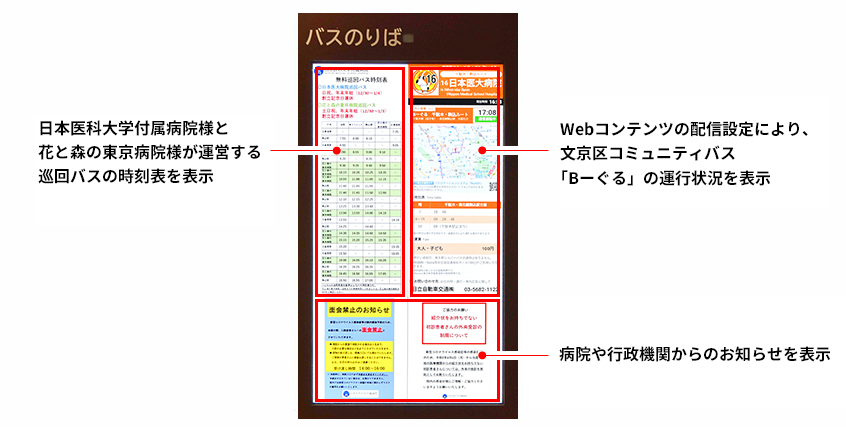 ロータリーには、日本医科大学付属病院様が運営する巡回バスと花と森の東京病院様の巡回バス、さらに文京区コミュニティバス「Bーぐる」も乗り入れています。限られたスペースを有効活用するため、3種類のバスの情報をデジタルサイネージに集約。巡回バスの情報は病院から遠隔配信する一方、「Bーぐる」についてはWebコンテンツの配信設定により運行状況を自動的に更新。病院の職員様にも文京区様にもできる限り負荷をかけずに、タイムリーに情報更新を行う仕組みを構築されています。