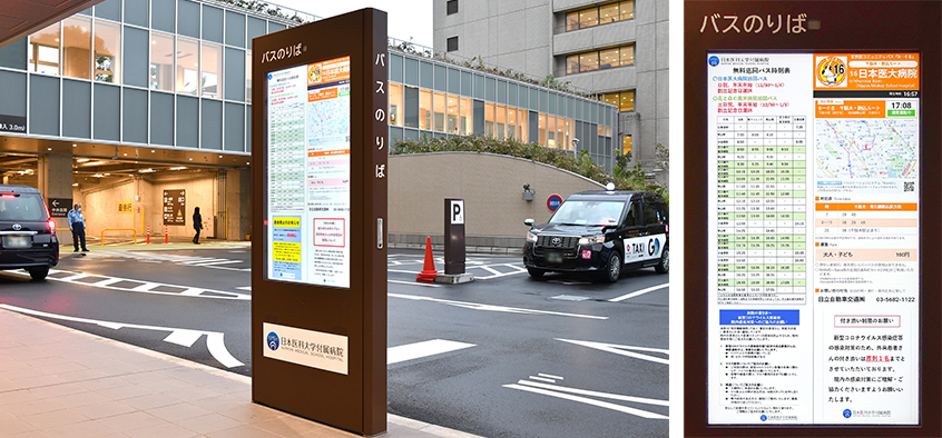 複数のバスが乗り入れる大学病院のロータリーにデジタルサイネージを設置。