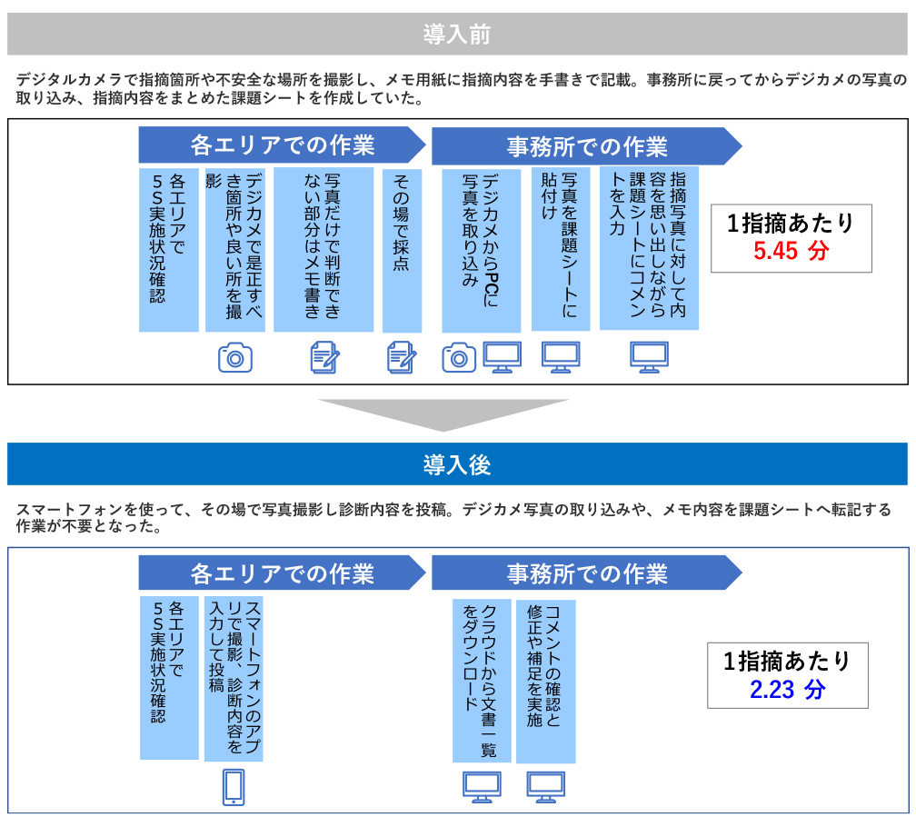 RICOH らくらくKAIZENサービス導入後の5S巡視では、スマートフォンを使ってその場で写真撮影し診断内容を投稿できるので、事務所に戻ってからデジカメ写真の取り込みやメモ内容を課題シートへ転記する作業が不要となりました。時間にすると、指摘1件あたりの所要時間は従来の5.45分から2.23分に短縮できました。2022年1月は指摘が296件でしたので、所要時間は26.9hから11.0hに短縮され、約59%の作業時間削減を実現しました。