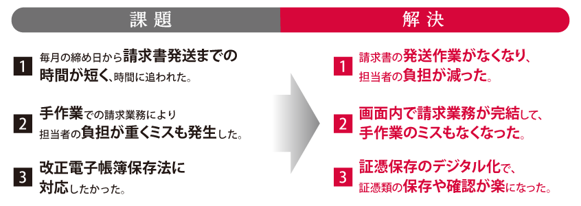 昨今の郵便事情の変化により、以前は間に合った発送スケジュールに余裕がなくなりました。「締め日から数日後に請求書の到着を希望される取引先もあります。送付先が関東や新潟などになると郵便物の到着までに時間がかかり、さらに土曜配達もなくなったので到着の遅れも心配でした。そのため、遠方へファクスしたり、郵便局の最終締め切りの時間までに駆け込んだりしていました」(掛田恭子様)
