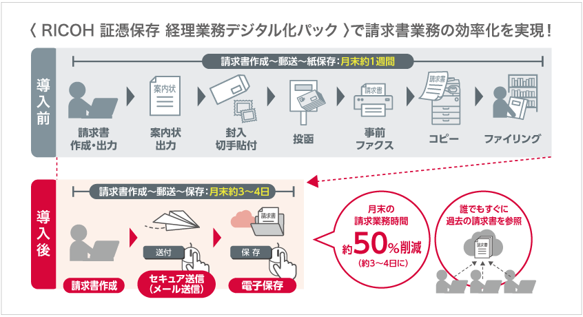 RICOH 証憑保存 経理業務デジタル化パックを導入する前の状況について、掛田恭子様は「請求書作成や押印だけでなく、送付状の作成や複数の請求書を封入するためのチェック、テープで閉じてからの切手貼りやスタンプの押印といった作業も当たり前のようにやっていました。リコージャパンから説明を聞いて、請求の仕事が楽になると思いました。コストについても、切手代やさまざまな面を考えると高いものではないと思います」と話します。導入後は封入ミスなどもなくなり、手作業で毎月1週間ほどかかった請求業務の作業時間は半分に削減されたそうです。