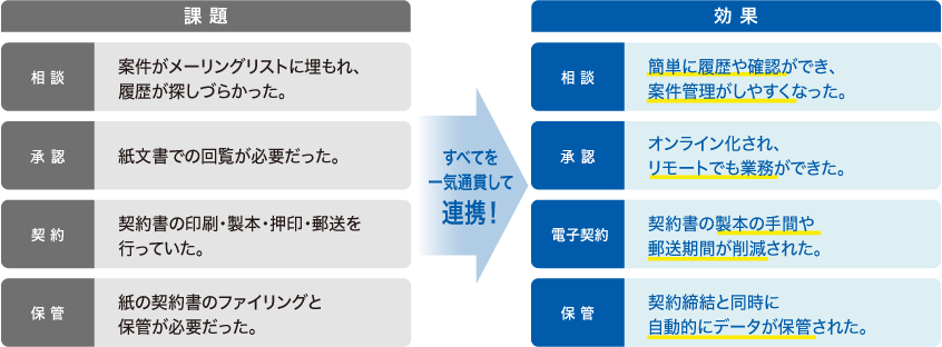 こうした押印業務の改善により、法務のDX推進は加速しました。押印に関わる社内実務の流れは大きく変わり効率化され、事業部の担当者はRICOH CWSを使いリモートで法務相談や承認申請の依頼ができるようになりました。