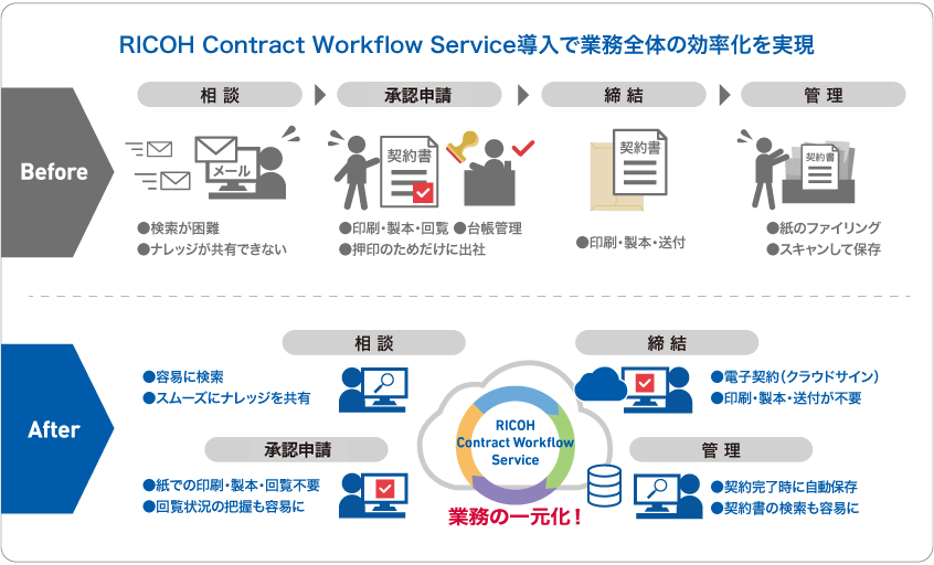 当時、リーガルテックの展示会でRICOH CWSを知り興味をもっていましたが、実際に使ってみると、契約業務の各工程が連携されていて、ペーパーレスでスムーズに進めることができ、これまでの負担が大幅に軽減されました。」と振り返ります。